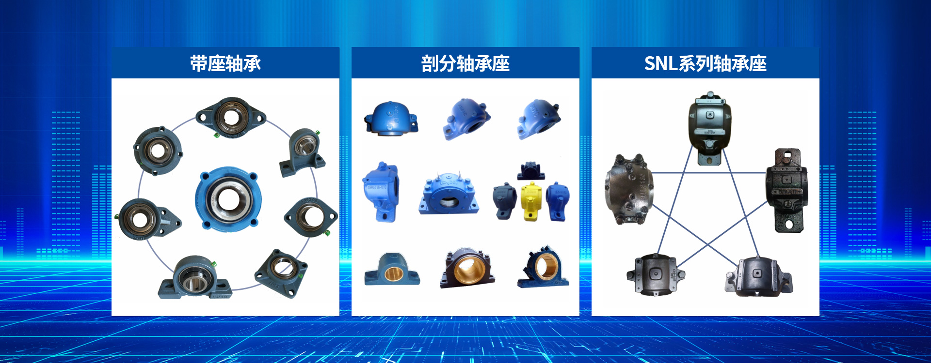 产品主要有:剖分式轴承座SN200系列、SN300系列、SN500系列、SN600系列、SN3000系列、SN3100系列、SNU500系列、SNU600系列、SD3100系列、SD3000系列、SD500系列、SD600系列、SD3000G系列、SD200E系列、SD300E系列、SAF500系列、SAF600系列、722500系列、1500系列、1600系列、Z2500Y(M)系列、Z2600Y(M)系列、Z4500Y(M)系列、Z4600Y(M)系列、GZQ2-72-260系列、GZQ4-130-400系列、GZ2-72-260系列、GZ4-130-400系列。滑动轴承座H2000系列、H4000系列、ZHC2系列、ZHC4系列、HX000系列、XHC4系列、HZ2000系列、Q/ZB86系列